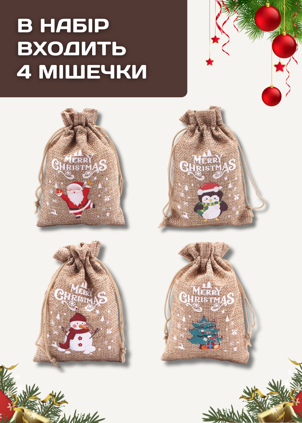 В набір входить 4 мішечки з різними принтами Санта Клаусом, святковим пінгвіном, сніговиком та новорічною ялинкою.